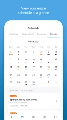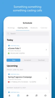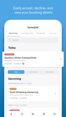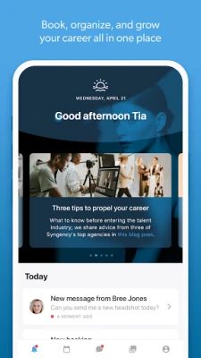 S Syngency Mobile získáte plnou kontrolu nad svým rozvrhem a obchodními příležitostmi. Okamžitě přijímejte či odmítejte nové nabídky, spravujte svůj kalendář s přehledem nad potvrzenými akcemi, opcemi i termíny vaší nedostupnosti. Ukládejte si „bookouty" snadno a rychle. Potřebujete vědět, kde se koná další zakázka? Aplikace vám ukáže přesné místo, nabídne navigaci přes Google Maps a dokonce umožní okamžitou rezervaci jízdy s Uberem nebo Lyftem. Všechny důležité dokumenty, jako jsou letenky nebo scénáře k castingům, máte vždy po ruce pro zobrazení a stažení. Komunikace s vaším agentem je navíc plynulá díky integrovanému chatu v reálném čase.