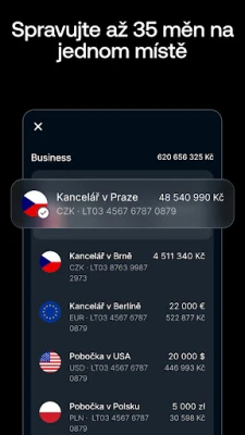 Využijte bleskové zprovoznění účtu přímo z mobilní aplikace, které zabere jen pár minut. Následně můžete bezstarostně posílat platby dodavatelům a spolupracovníkům po celém světě ve více než 35 měnách, s výhodnými mezibankovními kurzy. Zjednodušte správu týmových výdajů díky fyzickým a virtuálním kartám s nastavitelnými limity a schvalovacími procesy. Sledujte každou transakci, zaznamenávejte účtenky a automaticky kategorizujte, což usnadňuje export dat pro vaše účetní systémy a výrazně snižuje čas strávený rekonciliací.